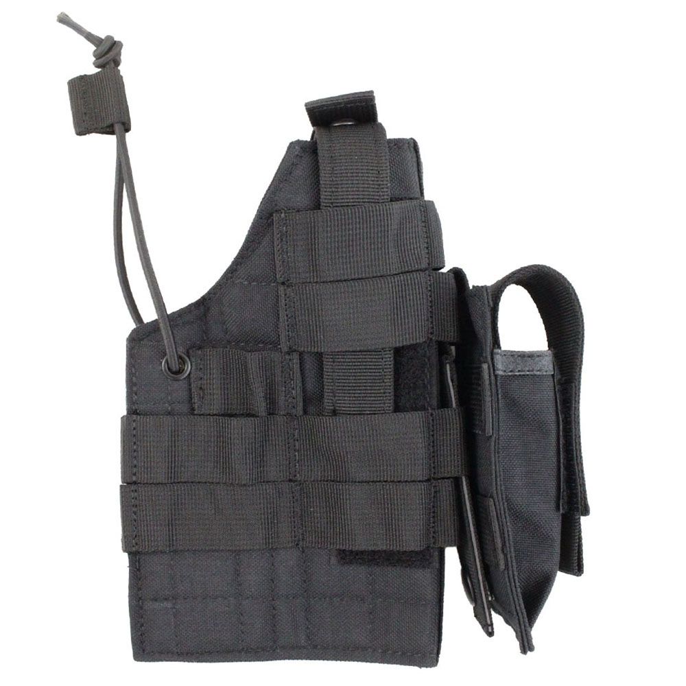 This Raven X pistol holster is a perfect fit for 1911 handguns. Constructed from 1000D nylon canvas, this rig is designed for a secure hold on the 1911’s unique size and shape. Your pistol is secured with a snap button retention strap and an elastic cord that allow for fast access in the field. The holster can be mounted for left or right hand carry on MOLLE compatible vests, drop leg panels, or belts. It also features an adjustable/removable magazine pouch with a hook and loop cover flap.