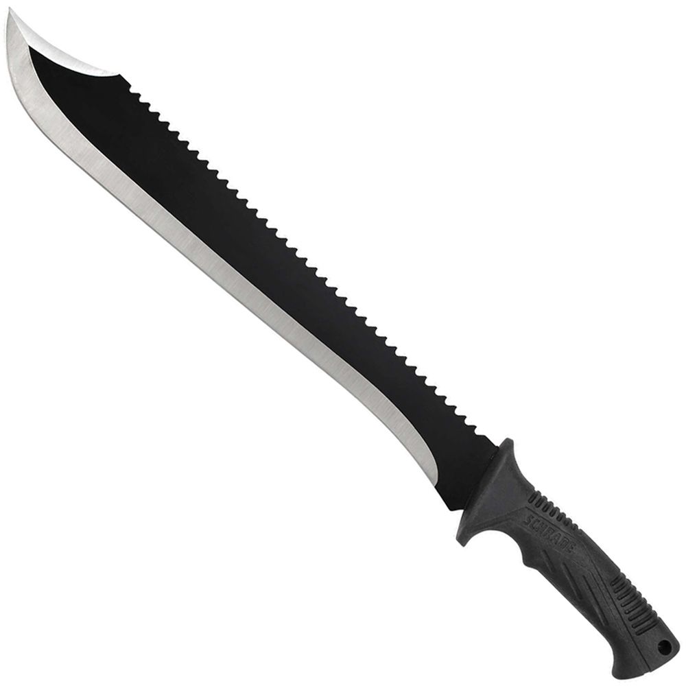 Schrade Full Tang Machete, 3Cr13 Stainless Steel Blade, TPR Handle, Lanyard Hole, and Polyester Belt Sheath.