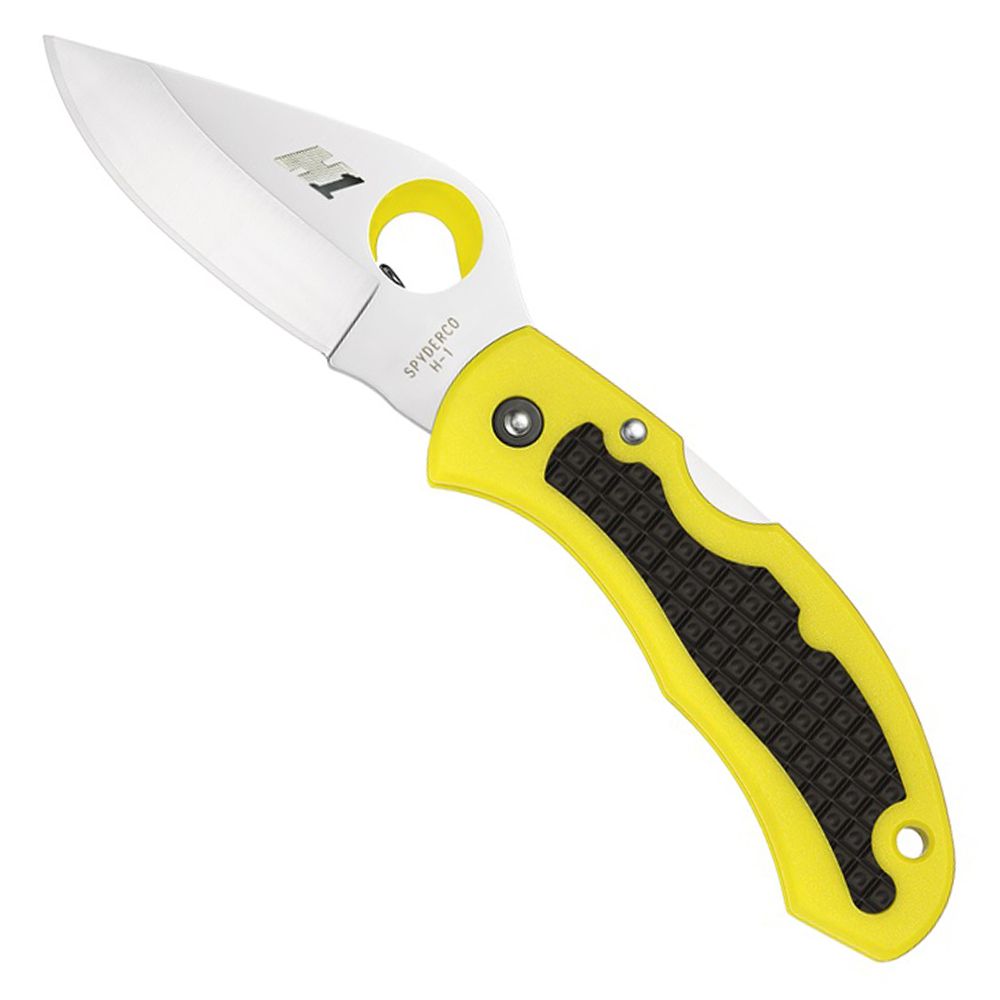 The Snap-It Salt features a broad, hollow-ground blade with an oversized Trademark Round Hole™ for exceptional leverage during right-handed one-hand openings. Available in either a Plain Edge or Spyder Edge format, it is paired with a high-visibility handle injection-molded from bright yellow fiberglass-reinforced nylon (FRN). The handle houses a stout back lock mechanism that locks the blade securely open and textured black Kraton panels for a secure grip, even when wet. The knife’s steel-reinforced FRN shackle features a spring gate that, like the other components of its screw-together construction, is also 100% rustproof.