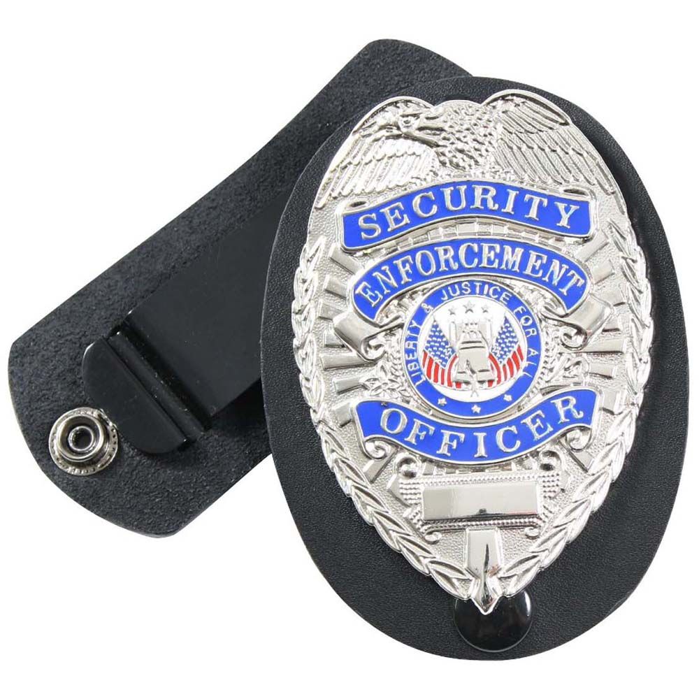 This Badge Holder Clip On W Swivel Snap Leather has a front and back top grain leather and is 3 mm in size. It is a shield shaped badge, has generic pin in hole for badge placement and snap closure. It is quite often used as police and office badge holder and is quite durable. Ideal for millitary purpose, it has iron clips measuring 2.3 cm* .5mm. Its dimension is 3.62"* 2.62". Its steel clip is a smart military gear.