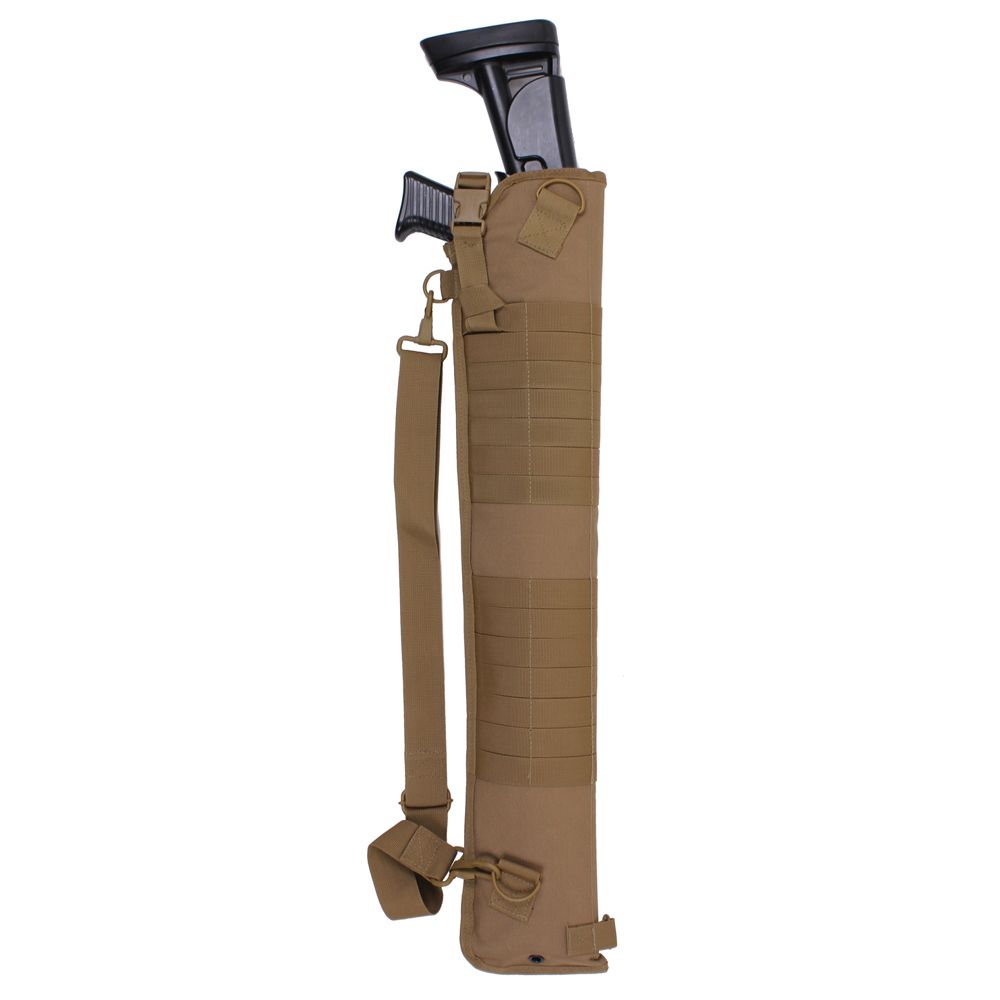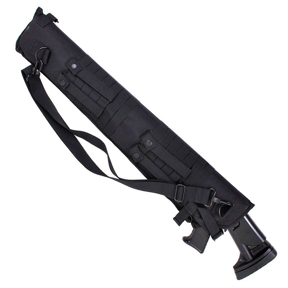 Tactical Shotgun Scabbard measures 29.5" in overall length with a 6" opening. The polyester scabbard has 1/2" of padding throughout and features 4 movable MOLLE straps, 70 MOLLE loops, removable and adjustable shoulder and retention straps, 4 D-rings, and 2 drainage holes.