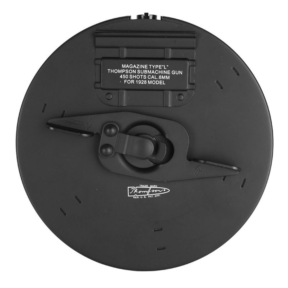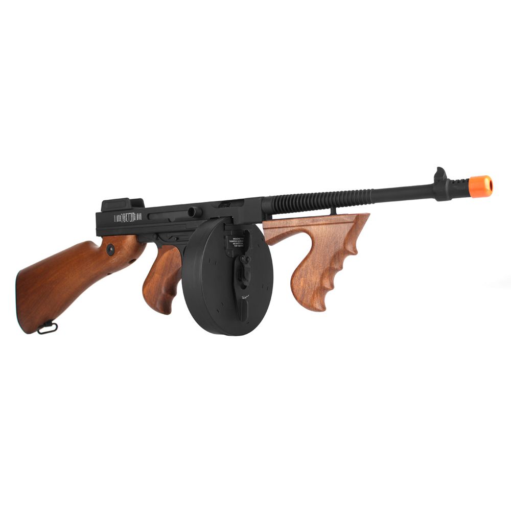 This Cybergun airsoft rifle is a bang on replica of the gangster's weapon of choice—the Chicago Typewriter. This authentic Thompson M1A1 machine gun features imitation-wood funiture, a full metal body, and a V6 metal gear box. An adjustable rear sight and hop-up system allow you to dial in your aim, not that you'll need to do when your blasting through the 450rd drum magazine in full-auto!