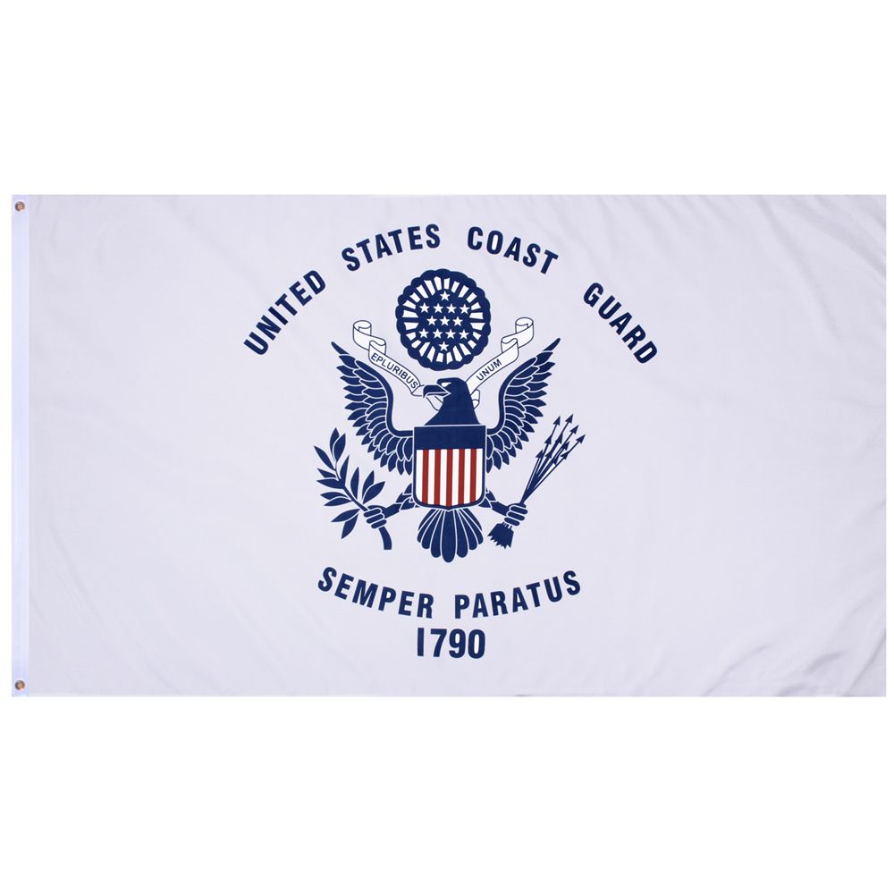 Show your support for the maritime forces with the US Coast Guard Flag. Crafted from strong 100% polyester, this rectangular 3' x 5' flag is designed for durability and visibility. The flag features a clean white background with a detailed blue emblem of the United States Coast Guard and corresponding text printed above the seal. Whether you're honoring service members or decorating for a patriotic occasion, this flag is a dependable choice for both indoor and outdoor use.