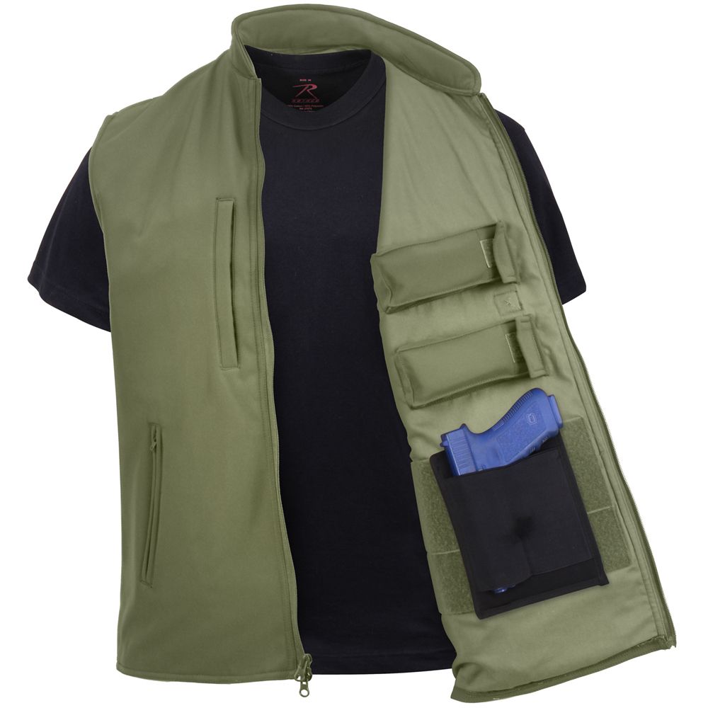 Concealed Carry Soft Shell Vest is the perfect addition to your concealed carry gear with 2 interior hook and loop fields for a concealed holster (1 on each side), and 4 interior mag pouches (2 on each side), which is ideal for securely holding your firearm and shooting accessories. In addition, this tactical vest features two front slash zippered chest pockets and two side slash zippered pockets to store essential everyday carry gear. The concealed carry jacket features a three-layer construction that deflects wind, wick away moisture, and retains body heat with the waterproof polyester outer shell, and lightweight interior fleece lining. This soft shell vest has a zipper closure that leads to a mandarin style collar. (Pictured with 10759 Universal Hook & Loop Holster - Not Included)