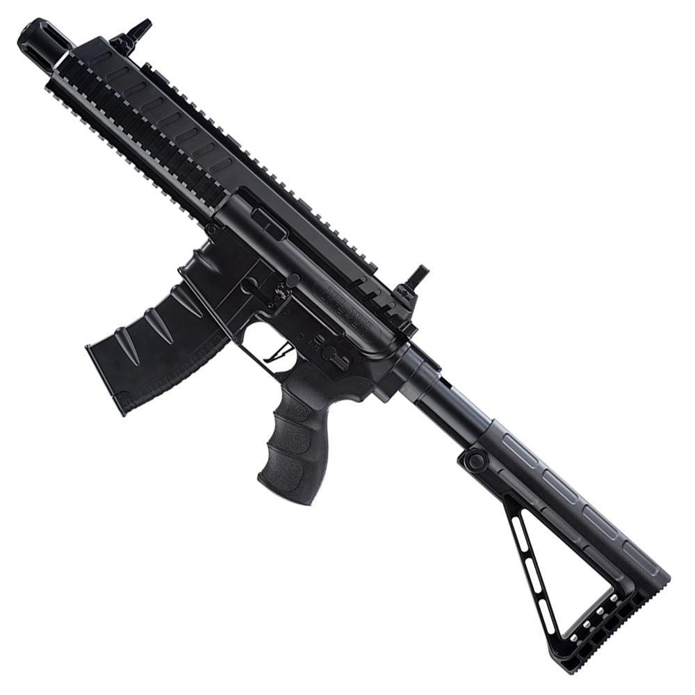 Umarex improved on their line of steel BB rifles with the production of the Steel Strike rifle. Built on the AR platform, this dual CO2 tank-powered rifle shoots in either semi-automatic or 6-round burst modes, with a realistic recoil that'll make plinking out in the yard a blast. It features ample rail space for optical accessories, if the included flip-up front and rear sights aren't enough. The included 30-round mag holds a 900 round hopper so frequent reloading will never be an issue with this affordable BB rifle.