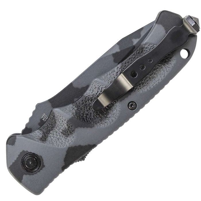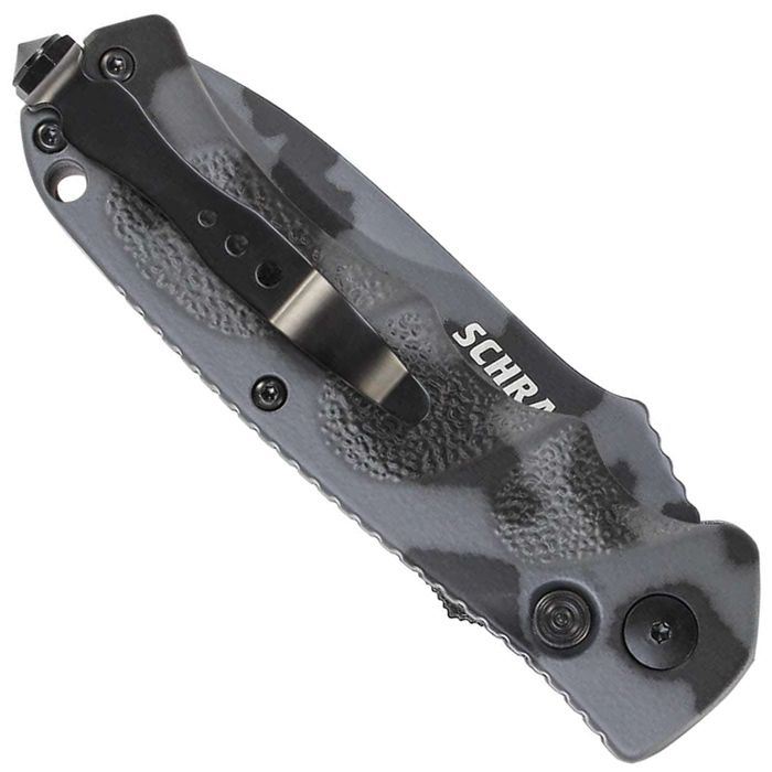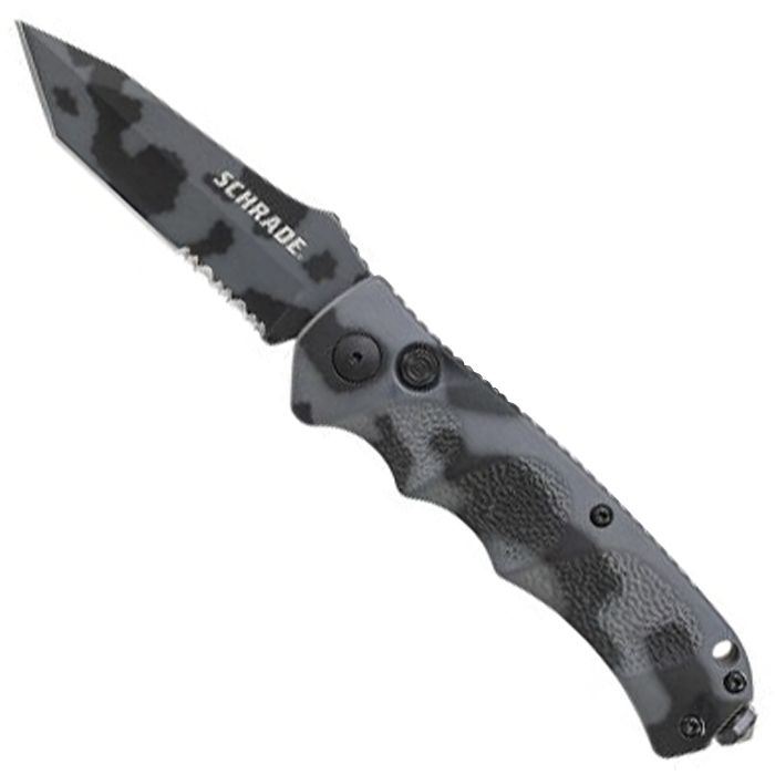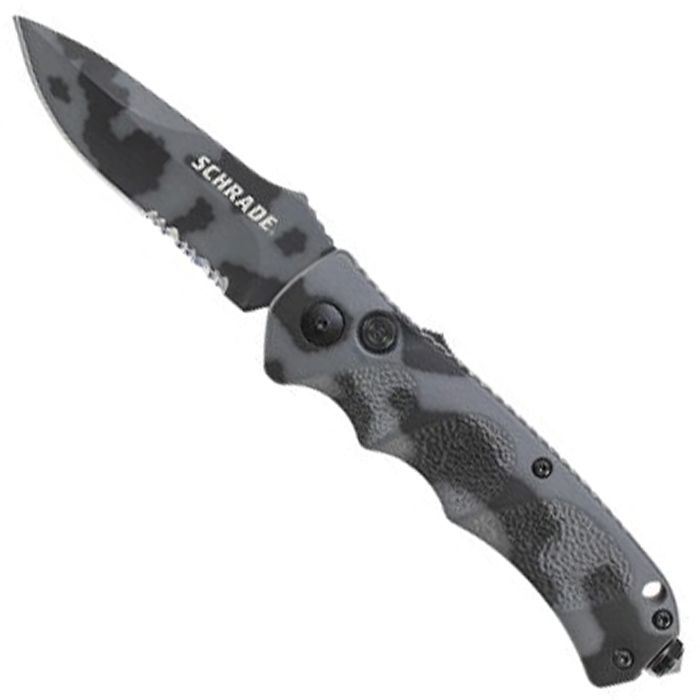 Schrade Push Button Lock Folding Knife, Urban Camo 4116 Stainless Steel, Urban Camo Aluminum Handle with Push Button Lock, Glass Break, Lanyard Hole, and Pocket Clip.