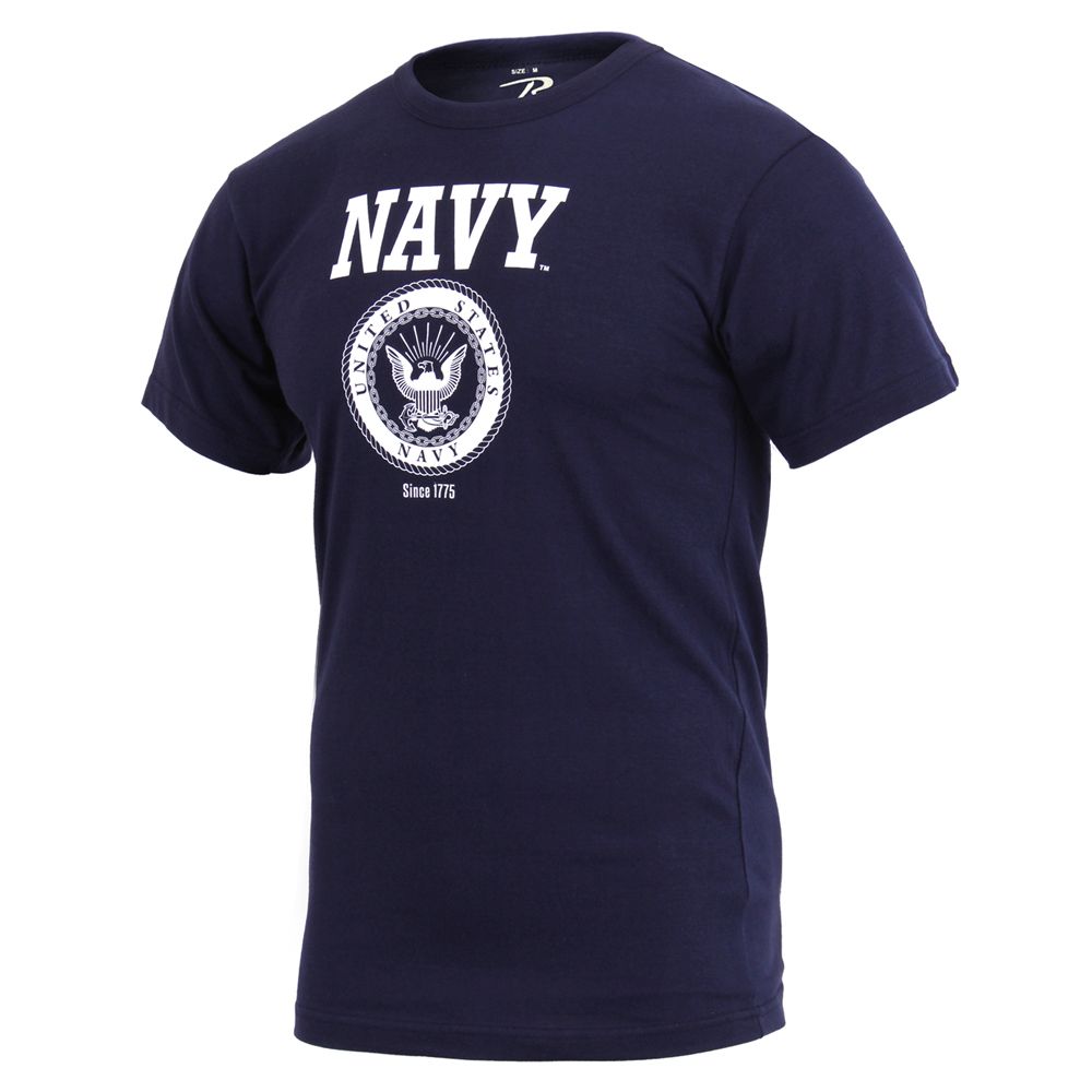 US Navy Emblem T-Shirt is made from a comfortable cotton/polyester material and features a Navy Emblem printed on the front. The shirt also contains a tagless neck label and a small white care label on the lower inside seam. Officially Licensed by the United States Navy.